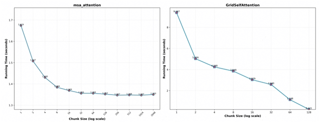 ? 整體而言,分塊尺寸與計(jì)算時(shí)間呈負(fù)相關(guān)關(guān)系,因此可在內(nèi)存容許的情況下,盡量增大分塊尺寸;下圖展示了 msa_attention 和 GridSelfAttention 在不同分塊下的計(jì)算時(shí)間;
