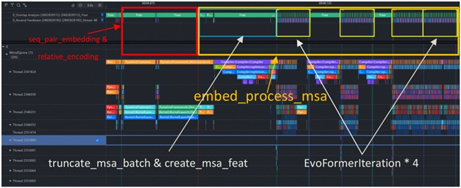 MindSpore 支持用戶使用 Profiler 類對模型的性能進(jìn)行采集,所獲得的 Profiling 數(shù)據(jù)記錄了詳細(xì)的算子時(shí)間線,也包括了算子的顯存占用信息。Profiling 數(shù)據(jù)可以通過 MindInsight 工具進(jìn)行可視化分析,可以查看詳細(xì)的算子時(shí)間線,以及流之間的調(diào)用關(guān)系。我們可以精確計(jì)算出每個(gè)模塊的位置及其耗時(shí),并據(jù)此來確定這些模塊是否需要進(jìn)一步的優(yōu)化。例如,下圖展示了我們對推理過程中 PairFormer 模塊的定位與拆解,為后續(xù)的時(shí)間、內(nèi)存的分析提供了框架與引導(dǎo):
