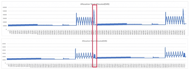 如下圖紅框處所示,a 為未優(yōu)化前顯存占用曲線,可以看到在紅框處達(dá)到峰值。通過分析可以確定此處位置用于計(jì)算 smooth_lddt_loss,因此將這個(gè)部分單獨(dú)進(jìn)行重計(jì)算后就得到了下圖的結(jié)果,此處峰值由 55G 下降到 20G 以內(nèi)。