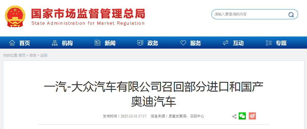 近日,一汽-大眾汽車有限公司依據《缺陷汽車產品召回管理條例》及其實施辦法,向國家市場監督管理總局提交了召回備案計劃,涉及兩款不同批次的奧迪系列汽車。