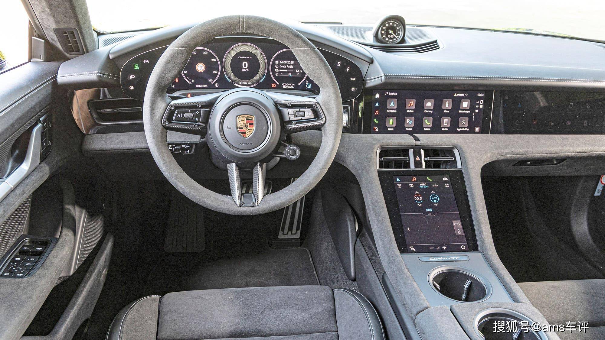 彎道性能的對(duì)比中,Taycan的優(yōu)勢(shì)更為顯著。其轉(zhuǎn)向系統(tǒng)的“透明度”在電動(dòng)車(chē)領(lǐng)域幾乎無(wú)出其右,即便前后軸同時(shí)承受巨大驅(qū)動(dòng)力,方向盤(pán)仍幾乎不受扭矩干擾,給予駕駛者極強(qiáng)的信心。而Lucid Air Sapphire在彎道中則顯得更為“敏感”——油門(mén)踏板的容錯(cuò)率極低,稍有不慎,動(dòng)力便會(huì)將車(chē)輛推出理想軌跡,電子穩(wěn)定系統(tǒng)的介入也更為頻繁。在大角度彎道中,Lucid雖能應(yīng)付,但需時(shí)刻壓著極限;而Taycan的ESP系統(tǒng)幾乎隱身,仿佛用魔法將車(chē)輛穩(wěn)穩(wěn)托在正確線路上,帶來(lái)更快的客觀成績(jī)與更強(qiáng)的主觀掌控感。
