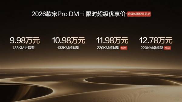 比亞迪近日推出2026款宋Pro DM-i 220km長續航版本,進一步豐富其插混SUV產品線。此次上市的新車包含兩款配置,官方指導價區間為12.28萬至13.08萬元,疊加限時3000元購置稅補貼后,實際售價下探至11.98萬至12.78萬元。至此,該車系已形成133km與220km雙續航版本布局,全系在售車型增至四款,價格覆蓋9.98萬至12.78萬元區間。