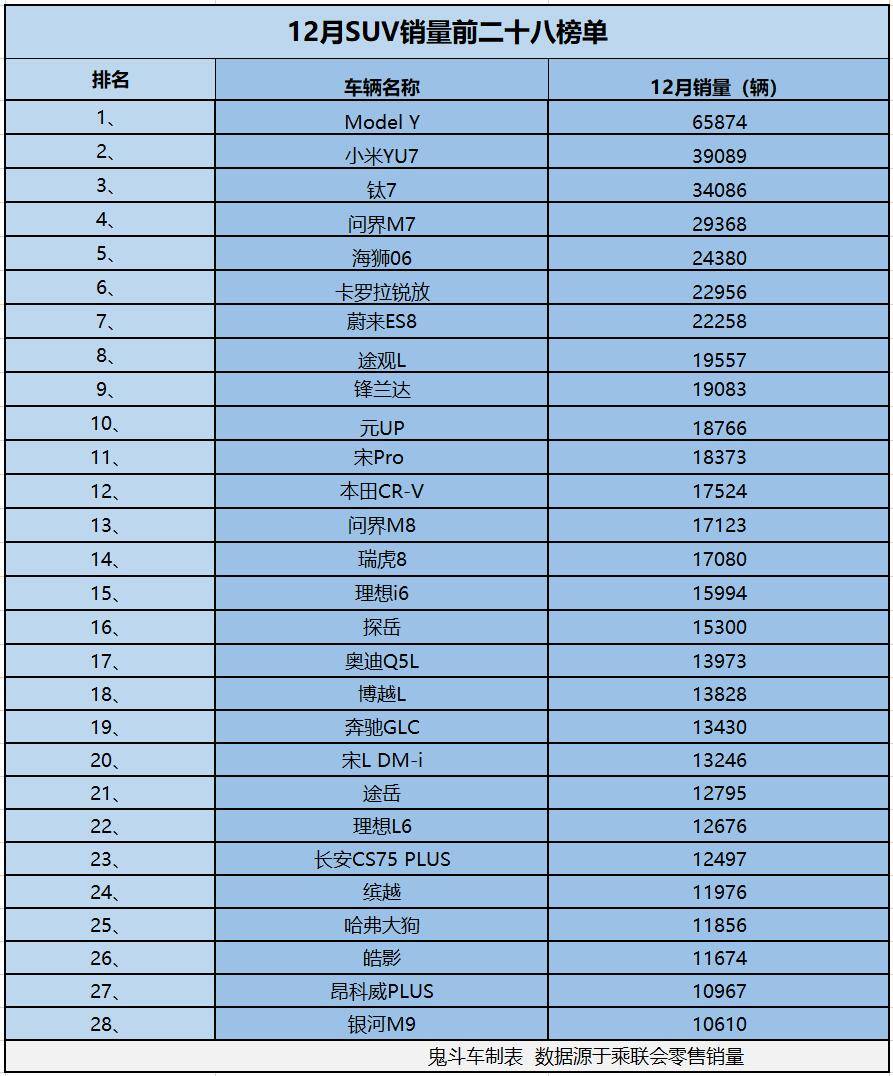 2025年12月SUV銷量揭曉:28款破萬 小米鈦7等新能源車型成市場新寵