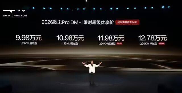 根據(jù)發(fā)布會(huì)信息,2026款宋 Pro DM-i長(zhǎng)續(xù)航版提供兩種配置選擇:220KM超越型在超級(jí)購(gòu)置稅補(bǔ)貼后售價(jià)為11.98萬(wàn)元,而220KM卓越型則為12.78萬(wàn)元。這款新車以其卓越的續(xù)航能力和節(jié)能表現(xiàn)成為焦點(diǎn),純電續(xù)航里程達(dá)到220公里,滿油滿電狀態(tài)下綜合續(xù)航里程可高達(dá)1600公里,百公里NEDC虧電油耗僅為3.2升,被譽(yù)為“SUV省油王”。