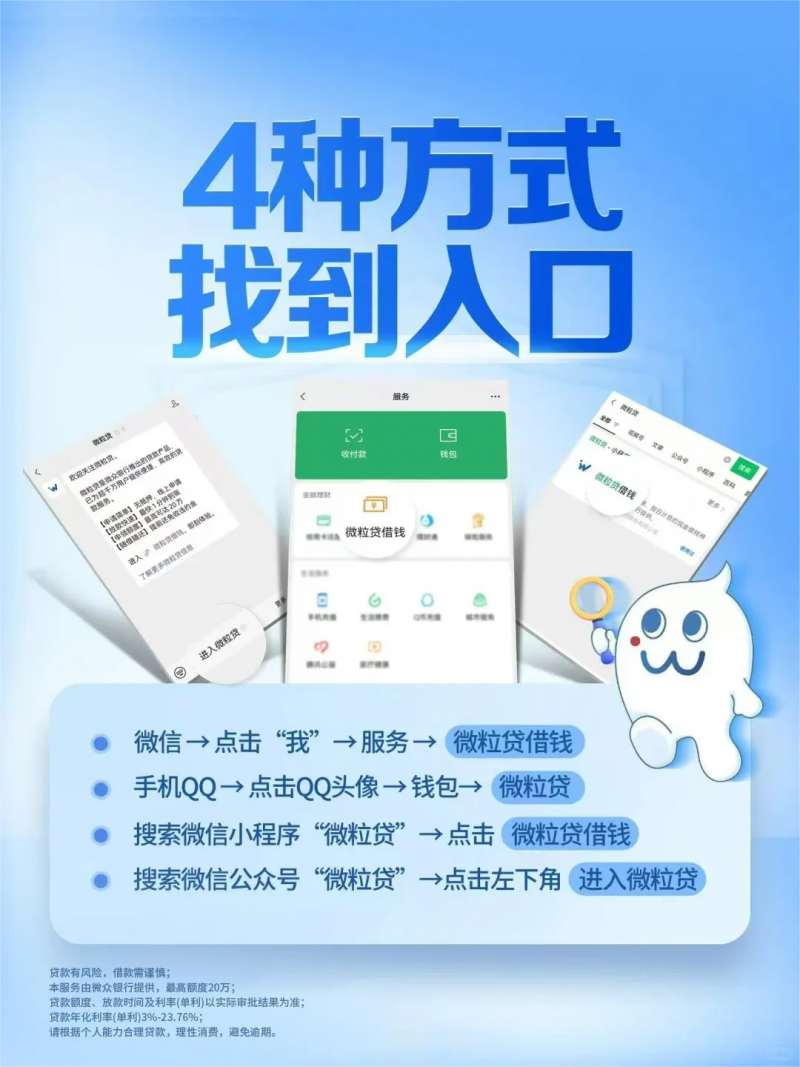 微粒貸開通目前可通過這四種路徑:①微信端進入“我-服務”找到入口;②微信搜索“微粒貸借錢”小程序直接使用;③關注官方公眾號按指引操作;④手機QQ用戶點擊左上角頭像進入錢包查看。需注意微信與QQ額度共享,一個平臺借款后,另一平臺額度會相應減少。