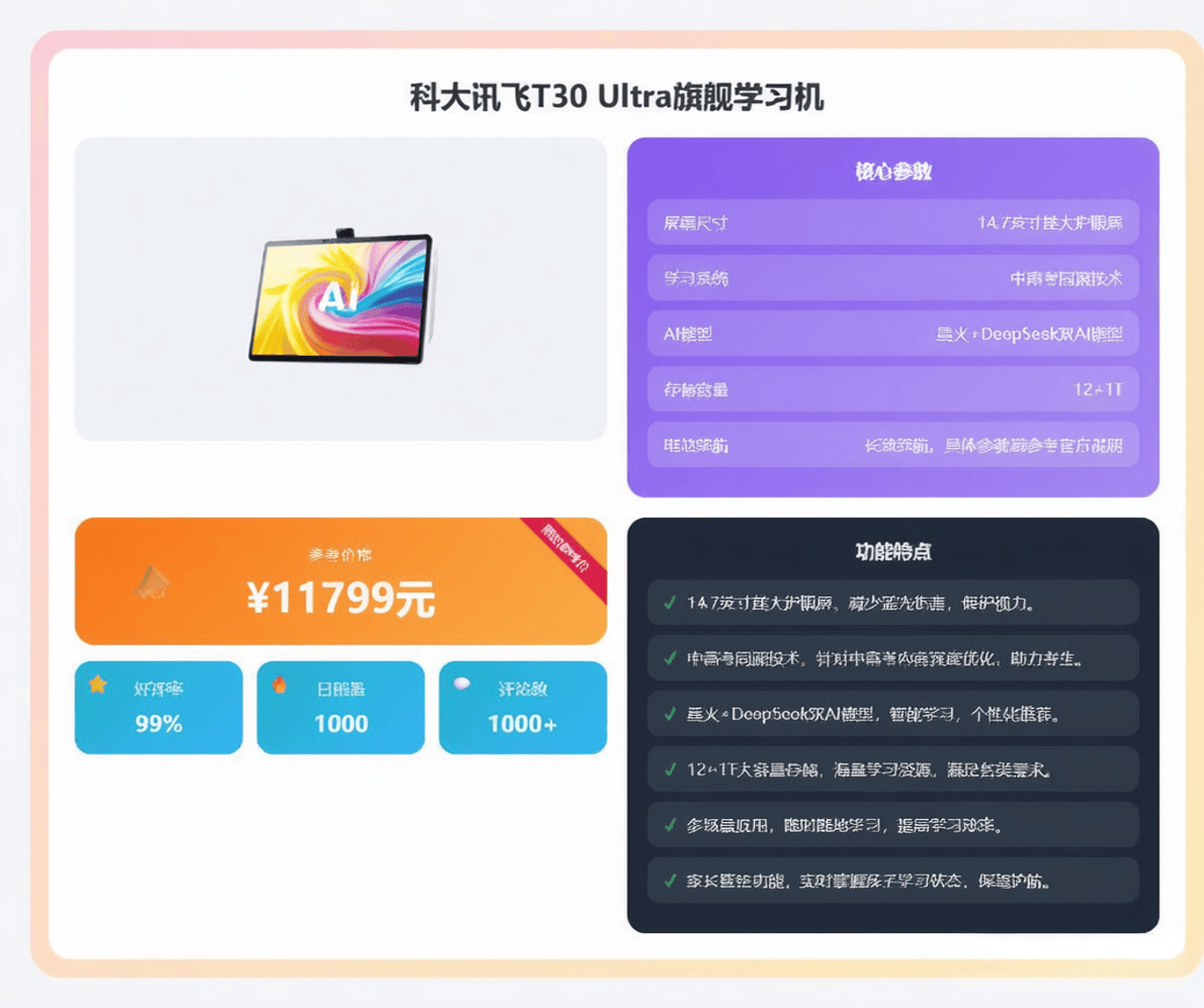對于追求旗艦體驗但預算敏感的用戶,T30 Pro以8999元的價格提供超值選擇。作為次頂配機型,該產品在屏幕尺寸、存儲容量等非核心參數上與萬元級Ultra版保持差異,但保留了95%的AI學習功能。實測表明,其知識圖譜構建速度與Ultra版僅相差0.3秒/題,而價格優勢達1200元。這種"旗艦體驗平民化"的定位,使其成為高端市場中的性價比黑馬。