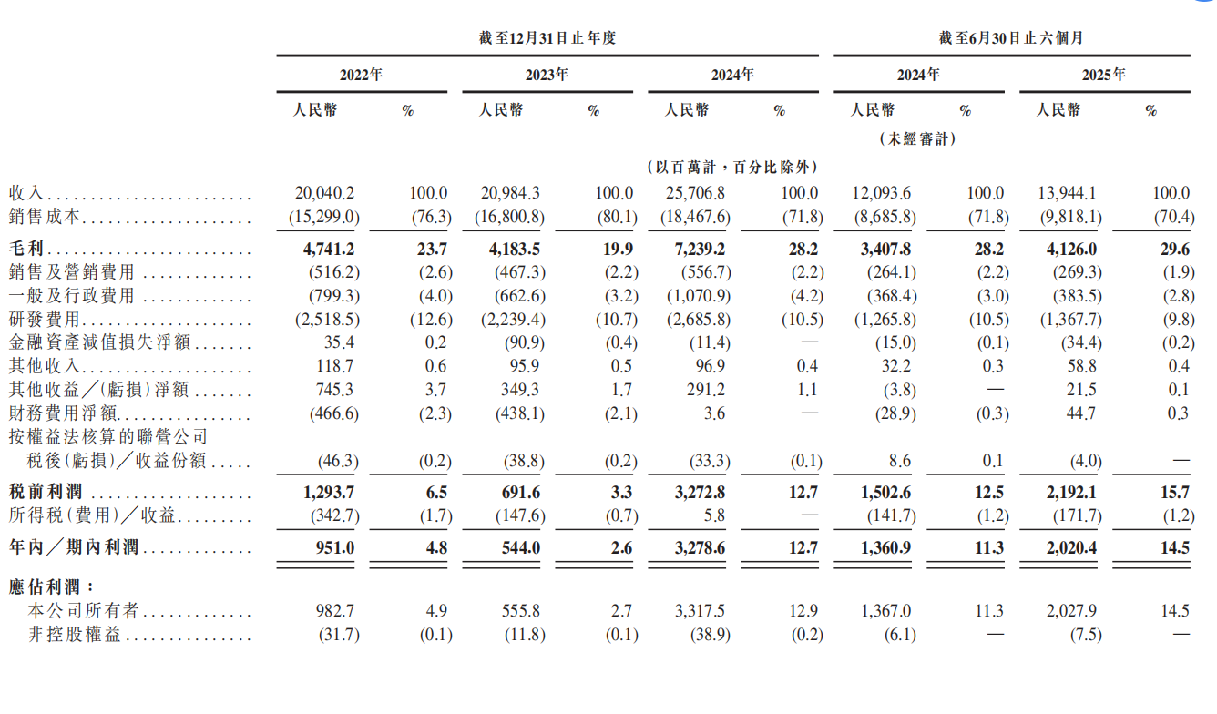 從財(cái)務(wù)表現(xiàn)來(lái)看,豪威集團(tuán)近年來(lái)業(yè)績(jī)?cè)鲩L(zhǎng)顯著。2023年、2024年及2025年前6個(gè)月,公司分別實(shí)現(xiàn)營(yíng)業(yè)收入209.84億元、257.07億元和139.44億元;同期凈利潤(rùn)分別為5.44億元、32.79億元和20.20億元,盈利能力持續(xù)增強(qiáng)。
