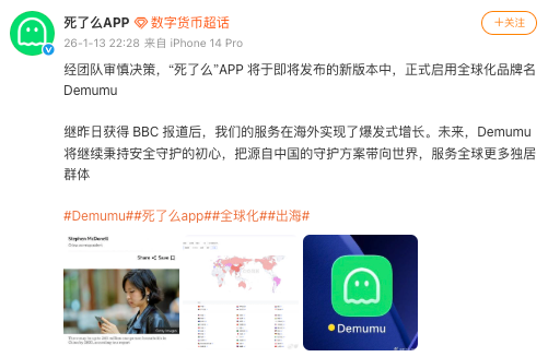 一款名為“死了么”的APP近日宣布,將在即將推出的新版本中正式啟用全新全球化品牌名稱“Demumu”。這一決定由其開發(fā)團隊經(jīng)過慎重考慮后作出,旨在進一步拓展國際市場,提升品牌影響力。