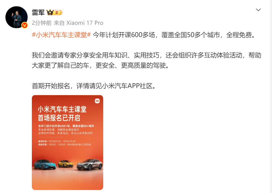 雷軍宣布:小米汽車車主課堂今年將超600場 免費服務(wù)惠及50余城