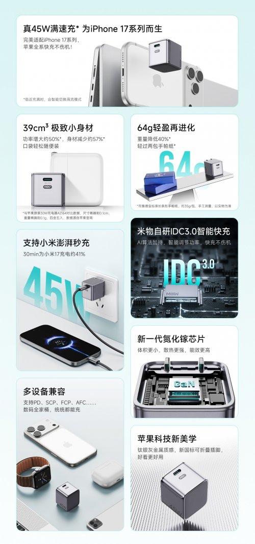 近日,小米生態鏈核心品牌米物科技正式推出新品小魔方45W氮化鎵充電器。這款集便攜設計、強悍性能與智能安全于一體的快充設備,憑借“核桃般超小體×45W滿功率輸出”的核心優勢,精準解決iPhone官方不配充電器的痛點,為iPhone 17全系、輕薄本及多品牌數碼設備用戶帶來全新充電解決方案。