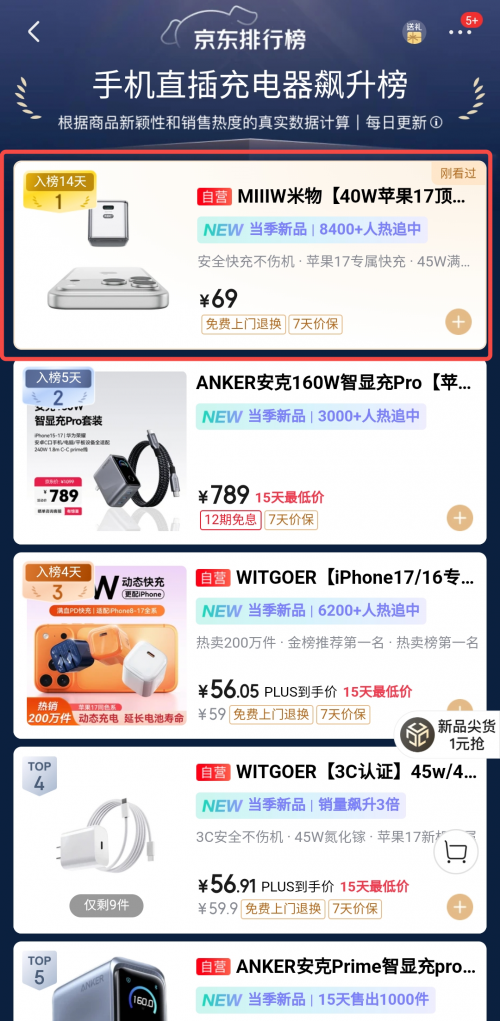 目前,米物小魔方45W氮化鎵充電器已在京東、天貓、抖音等各大電商平臺開售。一上線就大受青睞,連續霸榜京東充電器飆升榜TOP1!產品競爭力超能打!