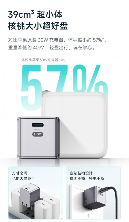 米物小魔方采用航天級氮化鎵芯片,在39cm3核桃般的超迷你體積內,實現了45W滿功率的持續穩定輸出,重量僅64g,較蘋果官方30W充電器體積縮減57%,配合可折疊插腳,可輕松納入小口袋、收納盒,成為通勤、差旅的便攜充電利器。