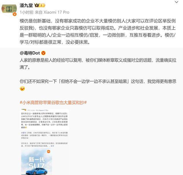 在后續互動中,潘九堂系統闡述了技術創新的發展路徑。他認為模仿與創新并非對立關系,所有成功企業都經歷過學習借鑒階段,但單純復制無法支撐長期發展。他提出"微創新競爭"理論:當行業聚集大量優秀企業時,通過相互啟發形成的持續改進將推動整體技術躍升,這種良性競爭最終會提升整個產業的技術水位。