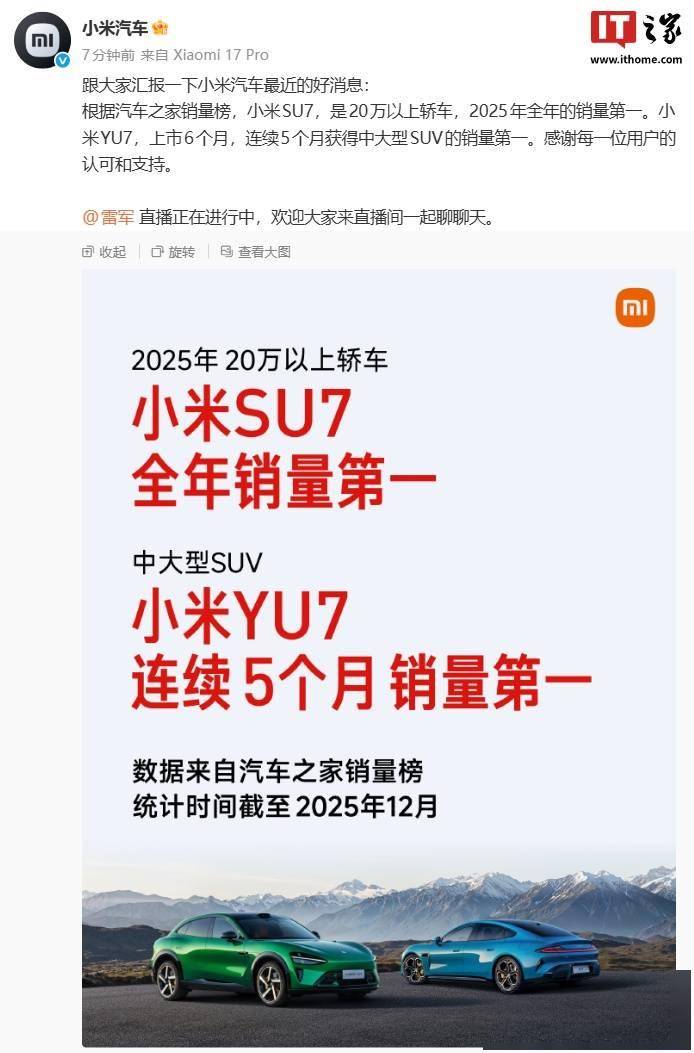 小米汽車近日在市場上持續發力,旗下多款車型表現亮眼。根據汽車之家最新發布的銷量榜單,小米SU7在2025年全年20萬元以上轎車細分市場中斬獲銷量冠軍,展現出強勁的市場競爭力。與此同時,小米YU7自上市以來表現同樣不俗,在短短6個月內連續5個月蟬聯中大型SUV銷量榜首,進一步鞏固了品牌在高端市場的地位。