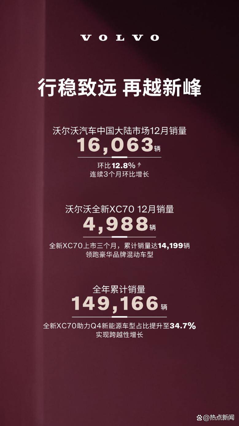 在豪華汽車市場競爭愈發(fā)白熱化的當(dāng)下,沃爾沃汽車在中國大陸市場交出了一份令人矚目的答卷。單月銷量達(dá)16,063輛,環(huán)比增長12.8%,全年累計(jì)銷量突破149,166輛。這一成績并非依靠短期營銷手段,而是長期戰(zhàn)略布局的成果體現(xiàn),在理性消費(fèi)主導(dǎo)的市場環(huán)境中顯得尤為珍貴。
