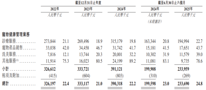 財務數據顯示,2022年至2025年上半年,瑞派寵物醫院持續經營業務收入分別為14.55億元、15.85億元、17.58億元及9.43億元,凈利潤分別為-0.62億元、-2.51億元、-0.59億元及0.16億元,經調整凈利潤分別為0.55億元、-1.21億元、0.7億元及0.73億元。報告期內,公司毛利率呈現波動趨勢,分別為22.4%、21%、22.2%及24.8%。截至2025年12月15日,瑞派寵物醫院旗下417家在營醫院通過收購方式取得,占比達77.5%。