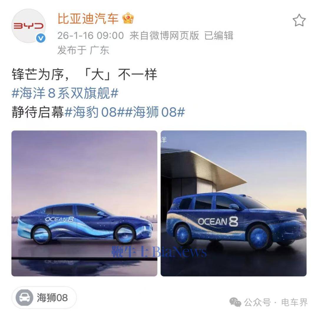 比亞迪近日通過官方渠道釋放重磅信息,確認海洋系列即將迎來兩款全新旗艦車型——海豹08轎車與海獅08 SUV。這一消息與本周早些時候曝光的路試諜照形成呼應,盡管目前僅公布了印有"Ocean 8"標識的偽裝車身圖,但已引發市場高度關注。