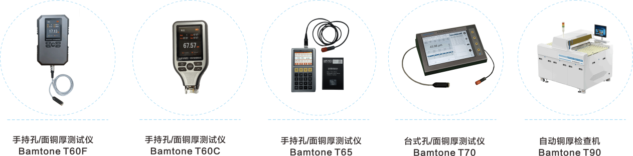 銅厚測(cè)試儀Bamtone T系列:替代進(jìn)口高精度銅厚測(cè)量設(shè)備,確保PCB等導(dǎo)電性能。產(chǎn)品線覆蓋手持、臺(tái)式機(jī)和自動(dòng)化銅厚測(cè)量多種類型。其中,Bamtone T60系列是由班通科技自主研發(fā)推出的國(guó)內(nèi)首款國(guó)產(chǎn)替代手持式銅厚測(cè)試儀,操作界面友好,精度高,性能媲美乃至超過(guò)日、美等國(guó)際品牌。
