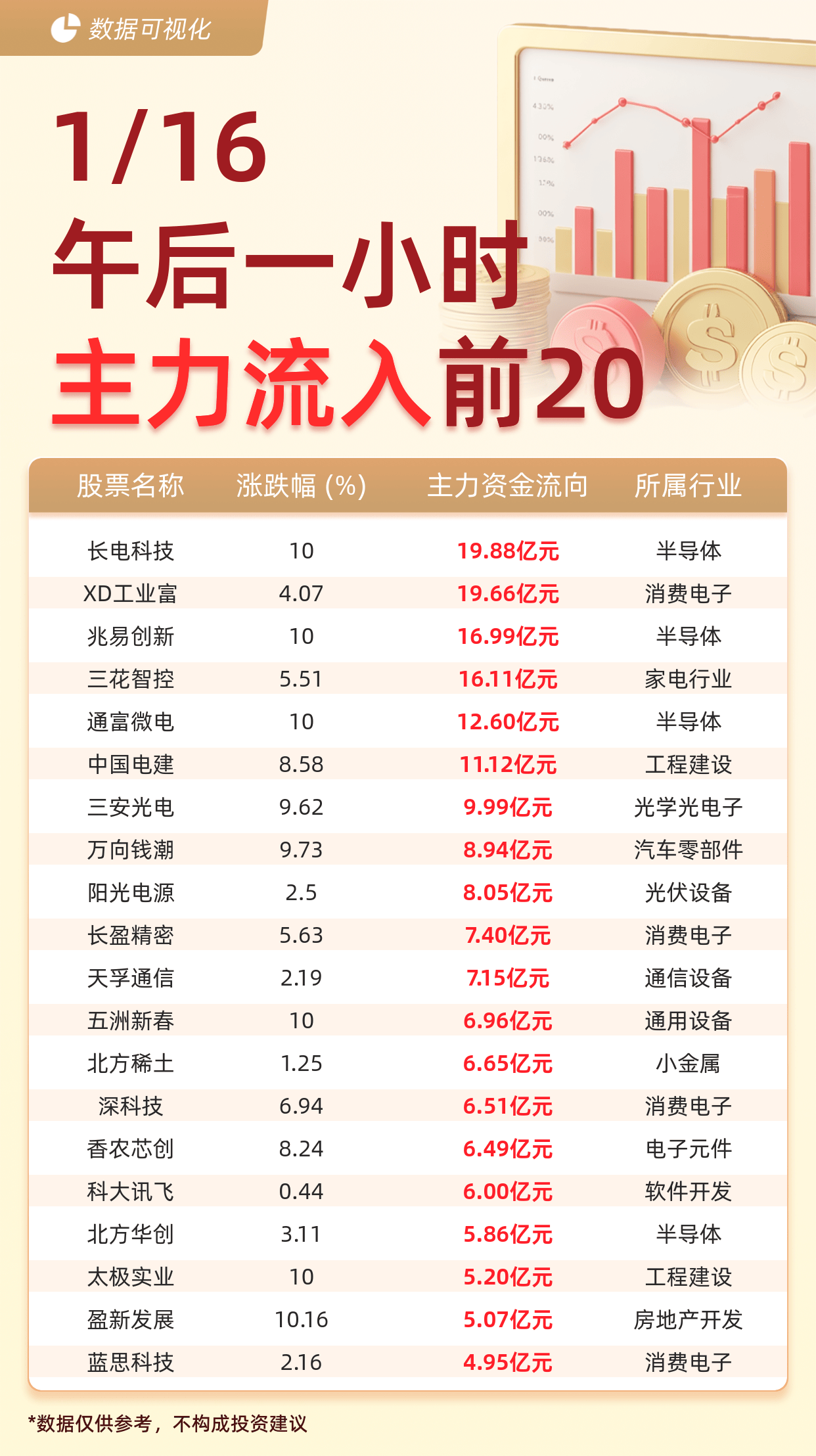 1月16日午后一小時主力資金動向:長電科技等20股成資金流入熱門標的