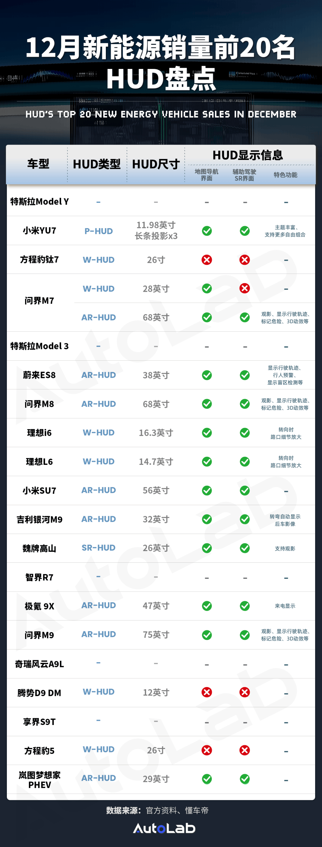 以去年12月新能源車銷量前20名的車型為例,HUD技術已呈現出多樣化的特點。AR-HUD(增強現實抬頭顯示系統)如今愈發常見,許多高端新能源車型都將其作為標配。AR-HUD不僅能夠將導航內容與實際路況精準結合,還具備比W-HUD更遠的成像距離和更大的成像面積。例如問界M9、蔚來ES8等車型,其AR-HUD可將光影與路面完美重合,生動呈現車輛的行駛軌跡,為駕駛者提供更為直觀的導航體驗。