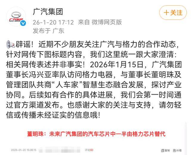 事件起因于1月15日廣汽集團董事長馮興亞率隊訪問格力電器,格力電器董事長董明珠親自接待。會面期間,雙方圍繞“人車家”智慧生態融合發展展開深入探討,重點聚焦產業協同與智能系統融合方案。盡管會后網絡流傳董明珠曾表示“廣汽未來汽車芯片半數將采用格力產品”,但廣汽集團明確指出,相關表述并未在正式交流中出現。