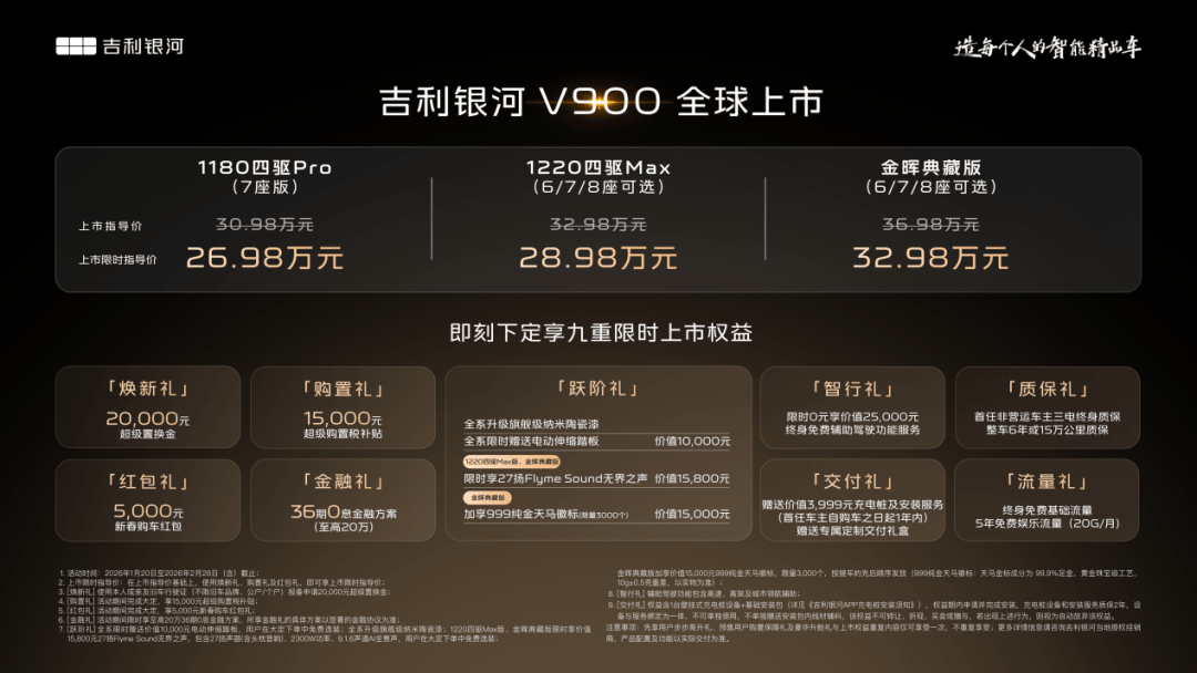 吉利銀河品牌在家庭MPV市場再落重子,其豪華V系列首款車型——AI全場景家庭旗艦MPV銀河V900正式登場。新車推出三個版本配置,涵蓋1180四驅Pro(7座)、1220四驅Max(6/7/8座可選)及金暉典藏版(6/7/8座可選),官方指導價區間為30.98萬至36.98萬元,上市期提供限時優惠價26.98萬至32.98萬元。