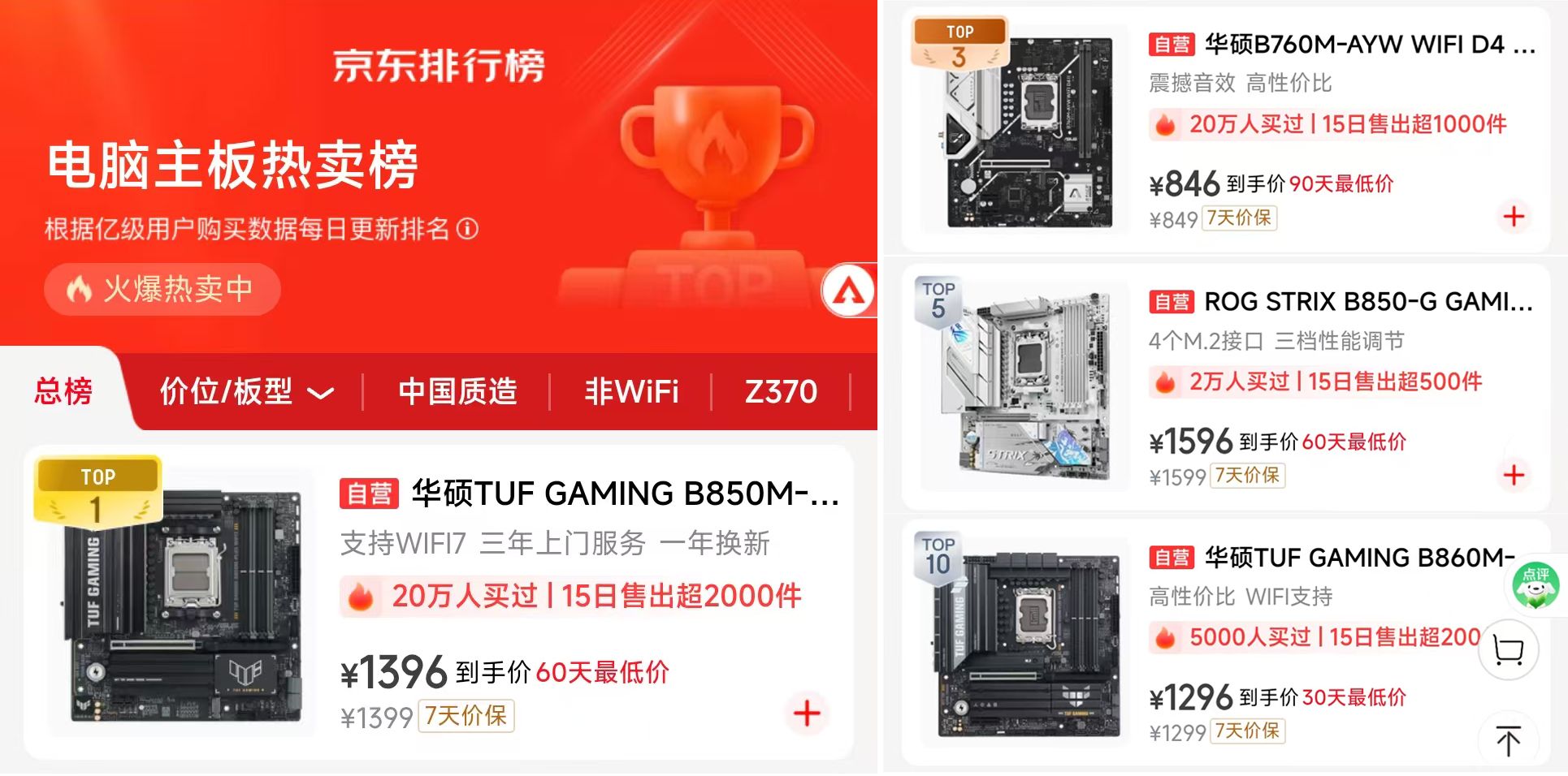 B850重炮手二代WIFI7領(lǐng)銜 多款華碩主板稱霸熱賣榜