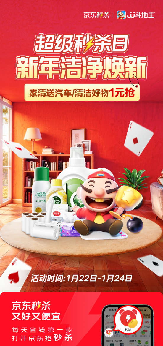 1月22日,來京東APP進入秒殺頻道參與活動,1元搶超值好貨、抽汽車大獎、囤清潔爆款,用實惠價格解鎖全屋煥新,以潔凈舒適的居家氛圍,迎接春節的到來!