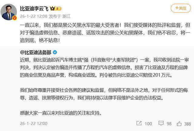 比亞迪再勝訴!抖音汽車博主因詆毀被判賠201萬,高管發聲維權