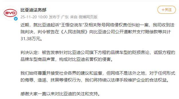 值得一提的是,此前比亞迪在維護自身權益方面已取得過成果。2025年11月20日,比亞迪汽車法務部發布消息,就比亞迪起訴“王悟空說車”及相關賬號網絡侵權責任糾紛一案,公司收到法院判決。判決結果顯示,被告需在《人民法院報》向比亞迪公司公開道歉,并支付賠償款等共計31.38萬元。法院認定,被告發表的針對比亞迪旗下方程豹品牌車型的貶損言論,嚴重詆毀了方程豹品牌車型的商品聲譽,構成對比亞迪名譽權的侵害。