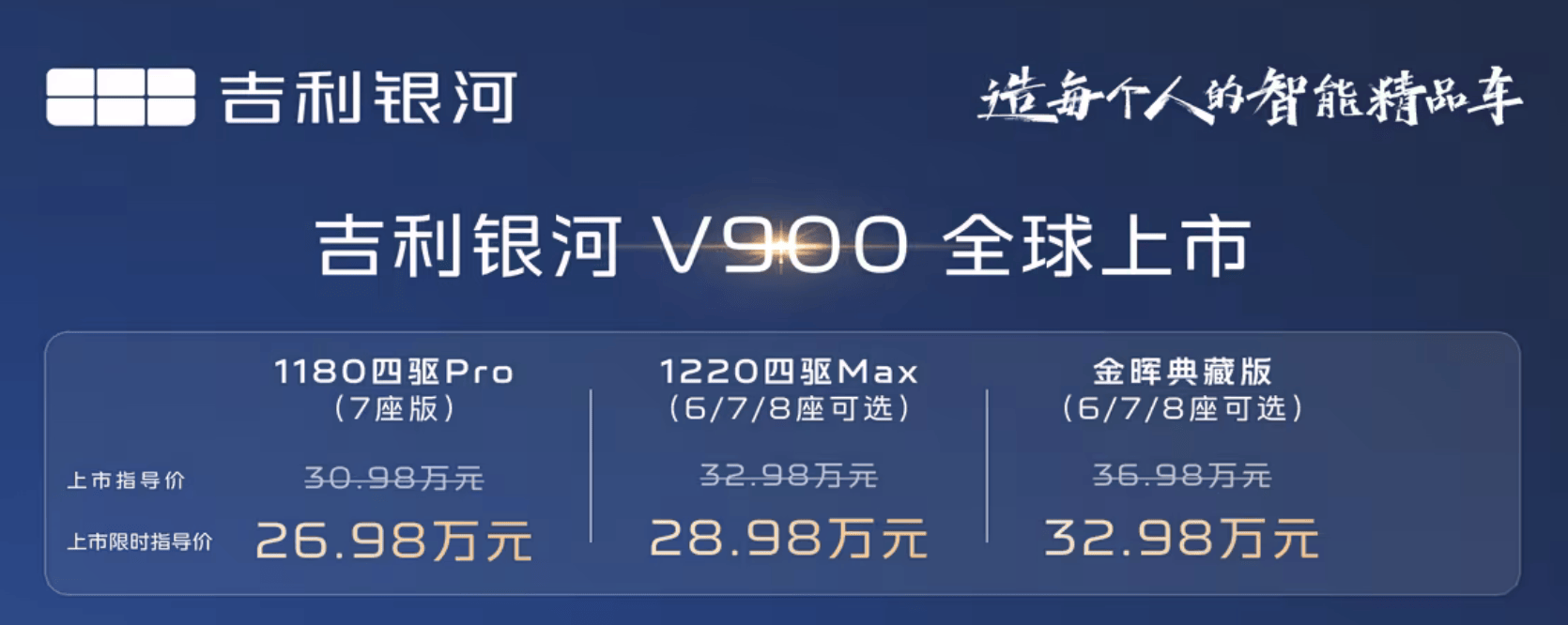 吉利銀河V900近日正式登場,標志著吉利銀河在豪華MPV領域邁出重要一步。這款新車共推出三款配置,限時指導價區間為26.98萬元至32.98萬元,較預售階段下調5萬元,展現出極強的市場競爭力。其直接對標別克GL8、嵐圖夢想家、騰勢D9等熱門車型,為消費者提供更具性價比的選擇。