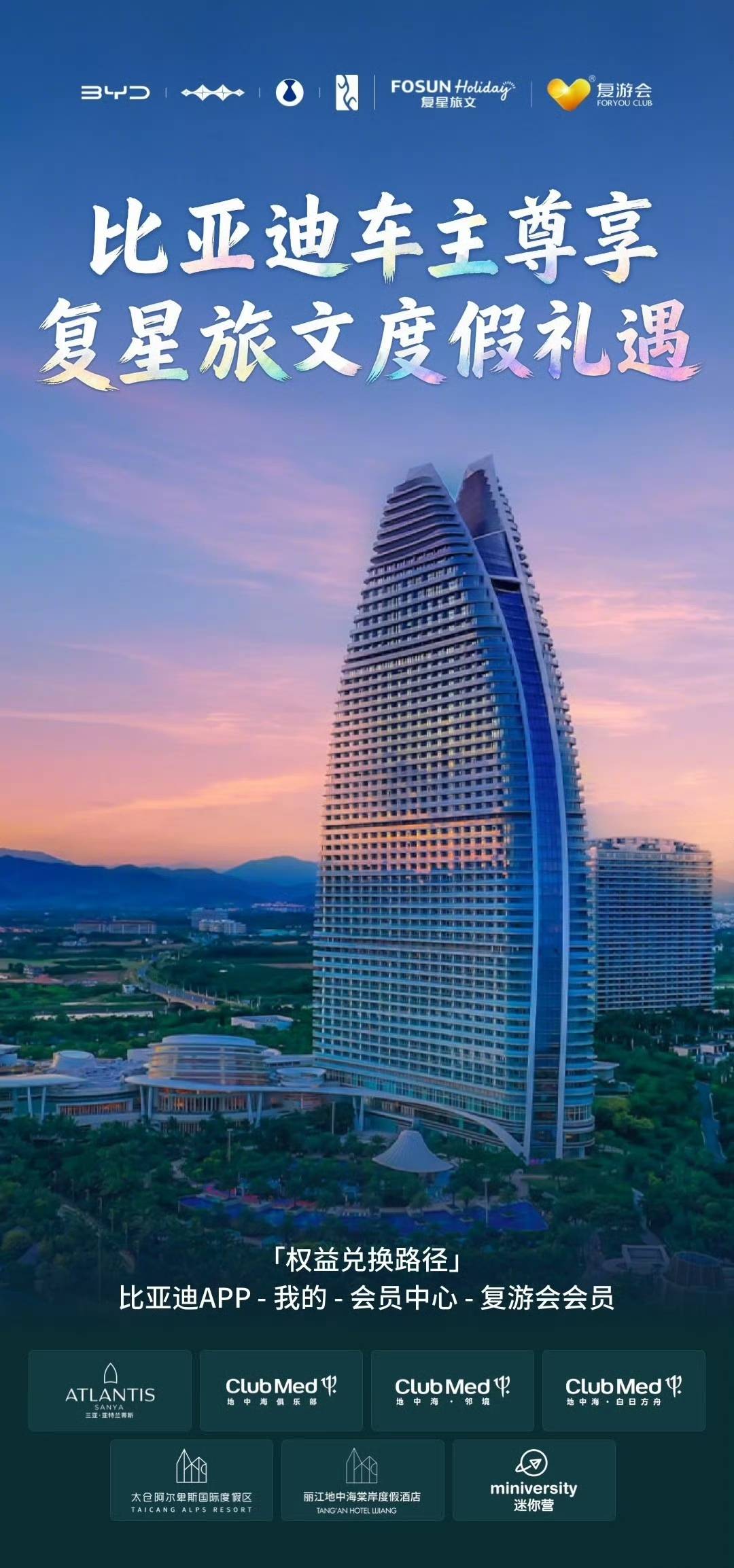作為合作核心內(nèi)容,復(fù)星旅文旗下高端會(huì)員品牌復(fù)游會(huì)(Foryou Club)的權(quán)益已正式接入比亞迪App。比亞迪、方程豹、騰勢(shì)、仰望等品牌車主可通過手機(jī)端一鍵申領(lǐng)復(fù)游會(huì)高等級(jí)會(huì)籍,立即解鎖三亞·亞特蘭蒂斯、Club Med地中海俱樂部等20余個(gè)國(guó)際知名度假目的地的專屬禮遇。這些權(quán)益涵蓋住宿優(yōu)惠、餐飲折扣、親子活動(dòng)等多元化服務(wù),形成覆蓋出行前中后全場(chǎng)景的增值服務(wù)體系。