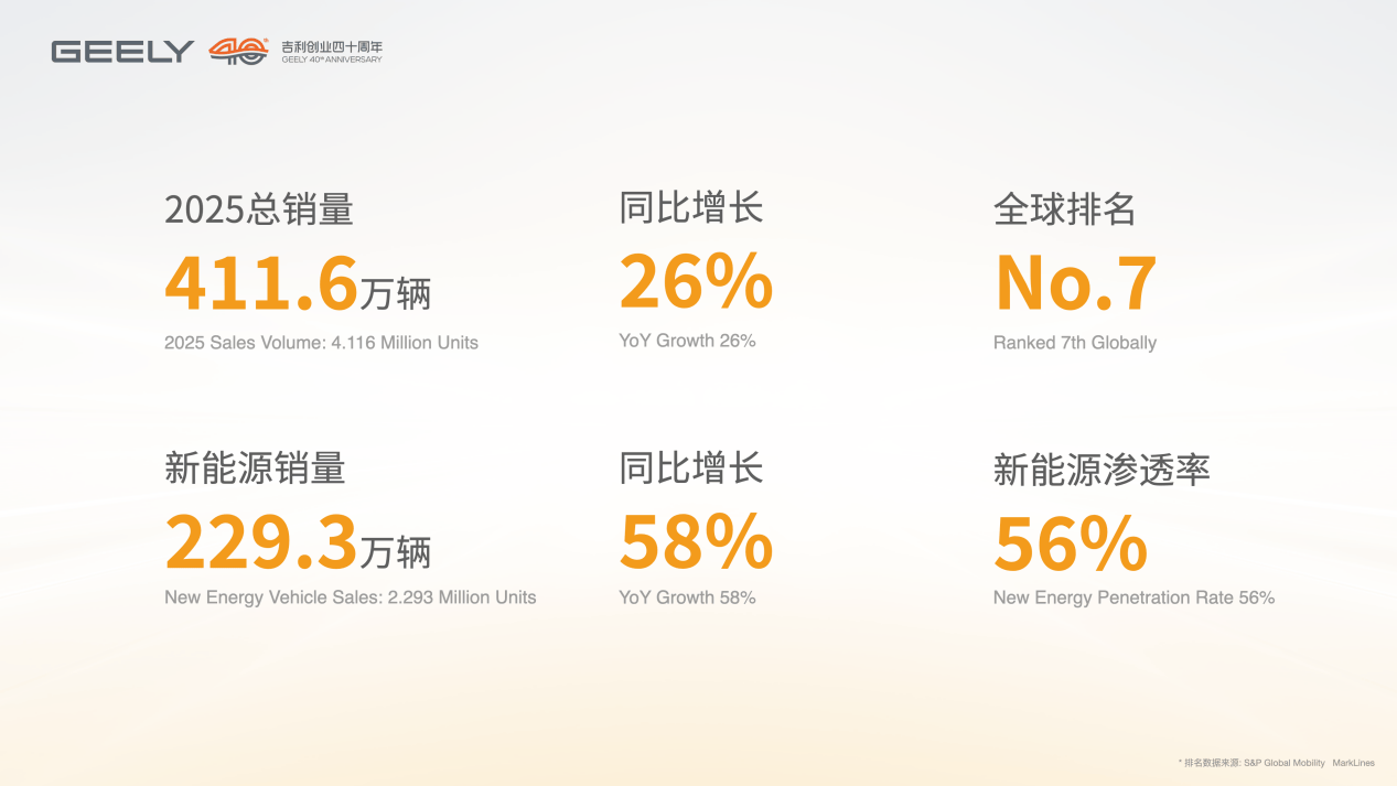 2025年,吉利控股以411.6萬輛的總銷量首次突破400萬輛大關(guān),其中新能源汽車銷量達(dá)229.3萬輛,滲透率攀升至56%。這一成績不僅使其躋身全球汽車集團(tuán)銷量第七,更以26%的同比增速成為前十中增長最快的企業(yè)。吉利控股集團(tuán)CEO安聰慧指出,未來五年將是集團(tuán)實(shí)現(xiàn)三大戰(zhàn)略升維的關(guān)鍵期:從產(chǎn)品制造轉(zhuǎn)向生態(tài)服務(wù)競爭力,從規(guī)模成本優(yōu)勢轉(zhuǎn)向綠色智能科技優(yōu)勢,從品牌獨(dú)立運(yùn)營轉(zhuǎn)向全球深度協(xié)同。