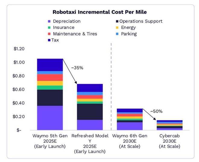 對比現有市場數據,Cybercab的成本優勢極為突出。ARK Invest報告顯示,Waymo第六代自動駕駛出租車到2030年的全包成本預計為每英里0.4美元(約合每公里1.73元人民幣),而網約車巨頭Uber和Lyft當前每英里成本在1至4美元之間(約合7至29元人民幣)。特斯拉通過技術創新實現的成本壓縮,或將徹底改變共享出行領域的競爭格局。