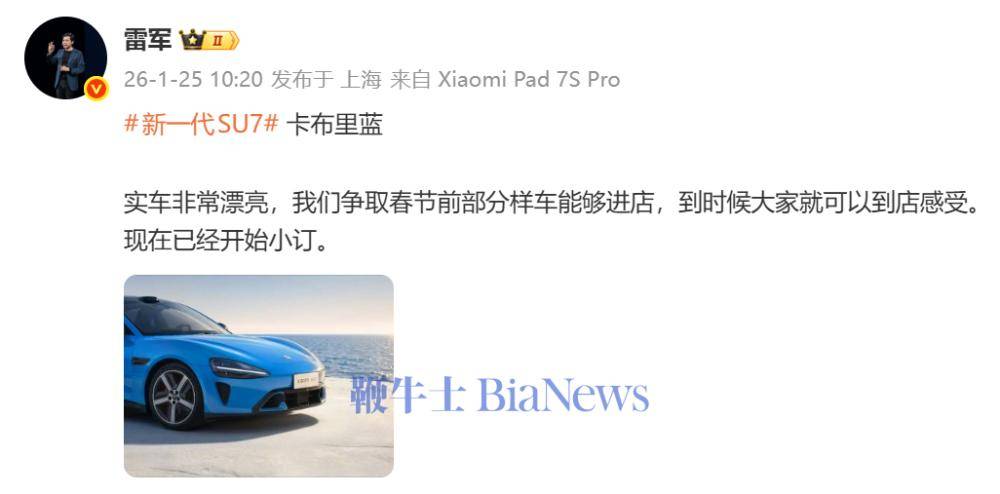 雷軍透露新一代SU7卡布里藍實車驚艷,春節前或迎部分樣車進店亮相