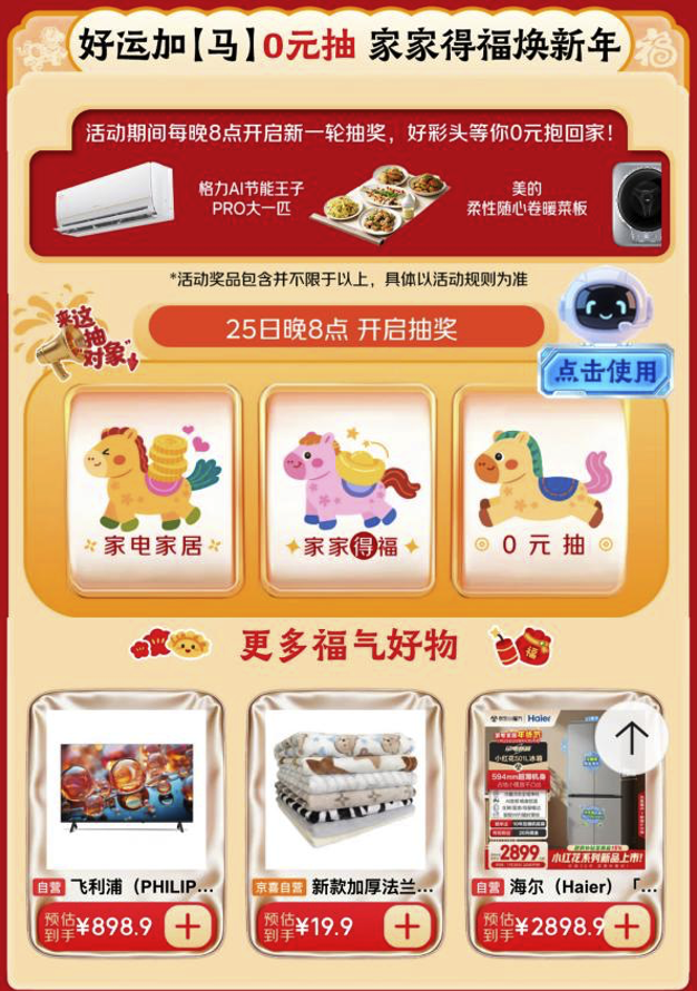 除了直接選購,還能試試手氣:價值5999元的三星量子點游戲電視、價值3519元的海爾12KG大容量洗衣機、價值3333元的格力AI節能王子Pro大一匹等品質家電家居產品,均有機會在“福袋0元抽”活動中免費帶回家。
