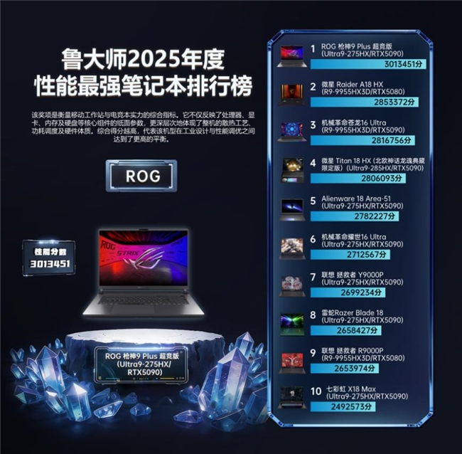 ROG 槍神 9 Plus 超競版 奪得“2025年度性能最強筆記本”。它不僅僅是把 Ultra 9 與 RTX 5090 放進一臺機身,而是把旗艦性能真正跑出來:冰川散熱 3.0 與液金覆蓋帶來更強的持續釋放能力,讓高性能輸出穩定“不斷電”,為 2025 旗艦性能本樹立了直接參照系。