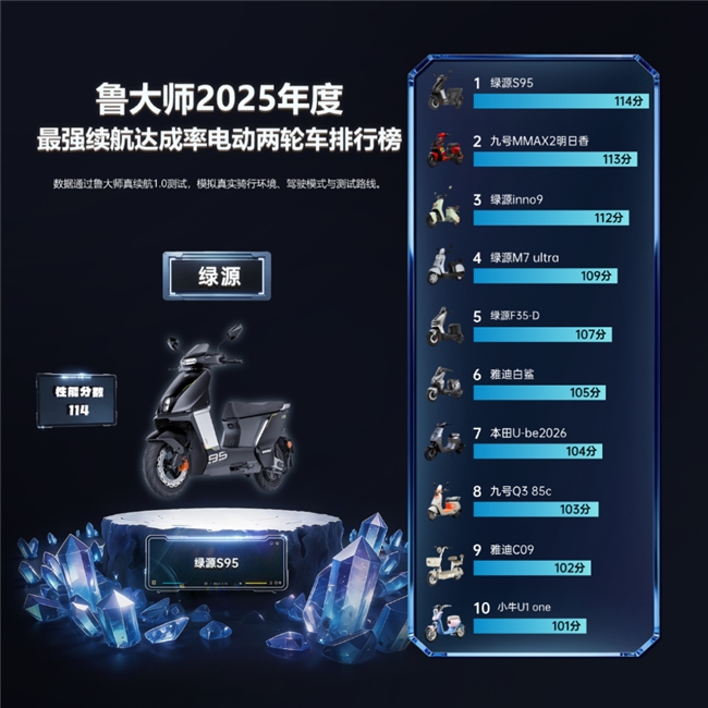 綠源 S95 榮膺“2025年度最強續航達成率”。在用戶最關心的續航問題上,綠源用精準能耗管理與智能溫控系統提升能量效率,基于路況實時調整功率輸出,讓實測表現穩定且超預期,直接解決用戶“續航虛標焦慮”的痛點。