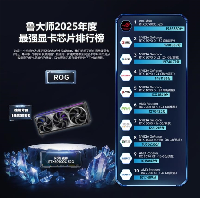 ROG 夜神 RTX5090OC 32G 獲評“2025年度最強顯卡芯片”。這是一張把旗艦性能與工程設計做到極致的顯卡:獨家四風扇系統與真空腔均熱板的組合,確保了極限負載下依舊冷靜穩定,體現了 ROG 在高端硬件領域“把性能釋放做成體系化能力”的長期積累。