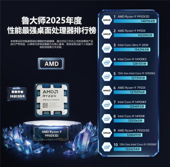 AMD Ryzen 9 9950X3D 榮獲“2025年度性能最強桌面處理器”。依托第二代 3D V-Cache 技術帶來的 144MB 超大緩存,其在高幀電競與專業生產力雙賽道同時拉滿上限:游戲端輕松突破千幀,創作端則以更穩定的吞吐能力建立優勢,代表了桌面平臺性能天花板的最新高度。