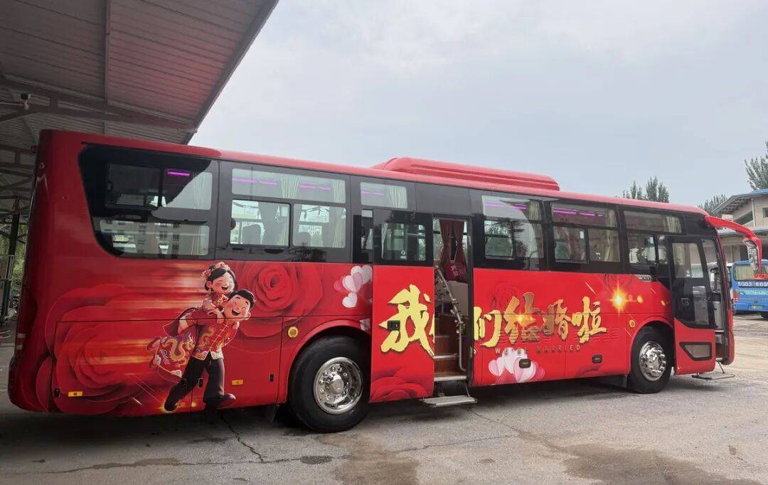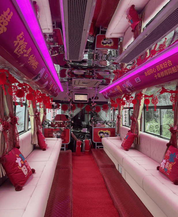 這輛別具一格的“大巴婚車”由張家口京西公共交通有限公司精心打造。車內采用軟包卡座設計,營造出舒適愜意的移動婚慶空間,車廂內隨處可見“百年好合”“永結同心”等祝福語。據公司負責人介紹,車輛內外均經過特殊改造,既保留了公交車的實用功能,又融入了婚慶元素,旨在為新人提供全新的婚禮體驗。
