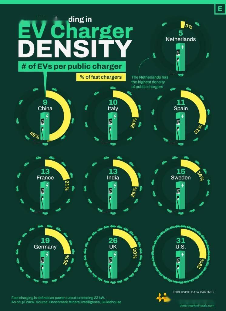 荷蘭以5:1的車樁比穩居全球首位,相當于每5輛電動汽車就能共享1個公共充電樁。不過該國快充設施占比僅3%,在快速充電領域存在明顯短板。中國則以9:1的車樁比位列第二,更引人注目的是其快速充電樁占比高達49%,在高速充電網絡建設方面形成獨特優勢。