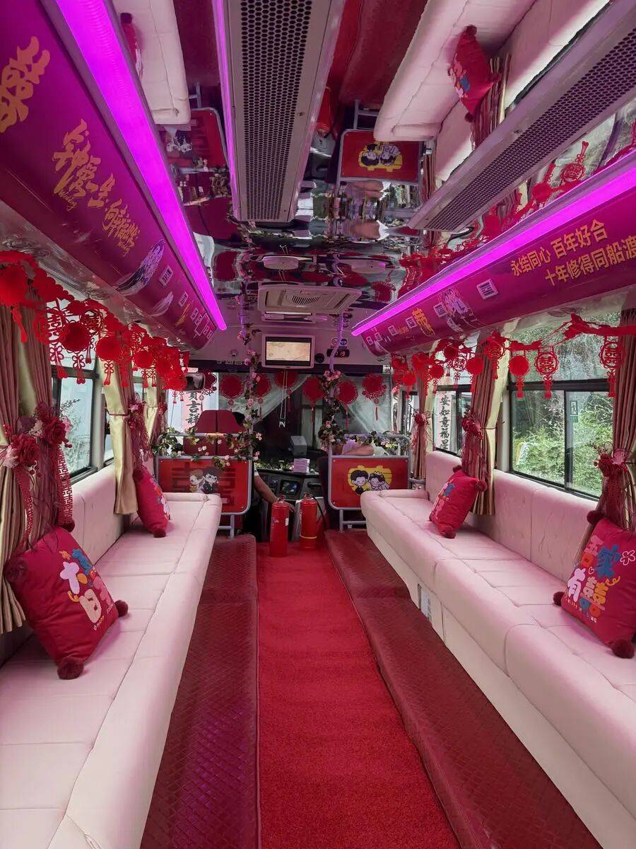 這輛新能源“大巴婚車”由張家口京西公共交通有限公司精心打造。車頭以鮮花點綴,車身則用“我們結婚啦”的標語進行渲染,車內卡座被布置成“移動婚慶廳”,還貼有“百年好合”“永結同心”等祝福語,營造出浪漫而喜慶的氛圍。這樣的設計不僅讓新人感受到了別樣的婚禮體驗,也讓參與婚禮的親友們感受到了濃厚的幸福氣息。
