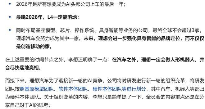 研發體系重組成為戰略落地的關鍵舉措。理想汽車將原有團隊拆分為三大板塊:基座模型團隊專注Mind GPT等核心AI技術研發;軟件本體團隊負責智能座艙、自動駕駛等系統迭代;硬件本體團隊整合汽車、機器人等實體產品開發。這種“模型-軟件-硬件”協同架構,旨在實現跨品類技術復用與資源高效配置。李想在2025年“AI Talk”活動中曾預言:“人工智能的汽車化將成為家庭科技普及的突破口”,此次調整被視為該理念的實踐延伸。