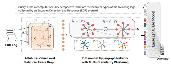 為此,360研究團(tuán)隊(duì)創(chuàng)新地將超圖推理與大語(yǔ)言模型相結(jié)合,提出HyperGLLM框架。該框架首先構(gòu)建屬性-值的關(guān)系圖,以捕捉低階結(jié)構(gòu)語(yǔ)義并減少文本冗余;隨后,引入集成多粒度聚類的微分超圖模塊,用于捕捉交錯(cuò)事件中的高階行為依賴關(guān)系;將超圖增強(qiáng)的語(yǔ)義表示與大語(yǔ)言模型對(duì)齊,從而實(shí)現(xiàn)對(duì)潛在惡意行為的高效上下文推理。