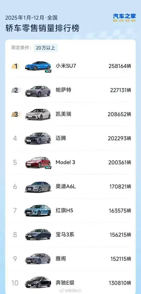 2025年20萬級以上轎車銷量揭曉 小米SU7超越帕薩特凱美瑞登頂年度冠軍