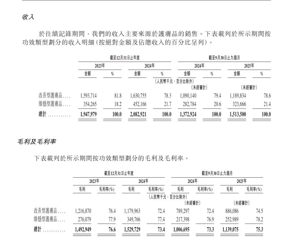 產(chǎn)品布局上,HBN形成五大核心系列:御齡緊致、美白煥亮、修護保濕、基礎(chǔ)護膚和控油祛痘,共36個在售SPU。其中改善型護膚品貢獻主要收入,2025年前三季度營收11.90億元,占整體收入的78.6%;維穩(wěn)型護膚品增速顯著,同期收入3.24億元,占比提升至21.4%。兩大產(chǎn)品線毛利率均維持在74%以上,展現(xiàn)出較強的盈利能力。