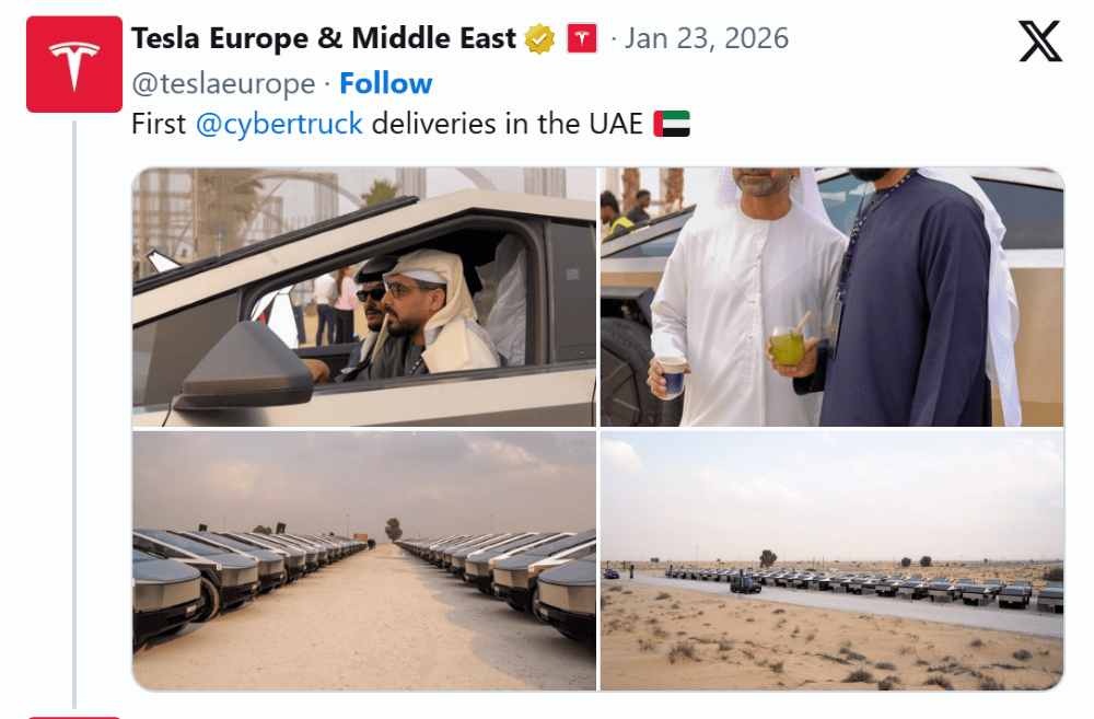 除了歐洲市場(chǎng)的深耕,特斯拉在中東地區(qū)也取得了重要進(jìn)展。在阿拉伯聯(lián)合酋長(zhǎng)國(guó),特斯拉完成了Cybertruck的首批交付,標(biāo)志著這一車型正式進(jìn)入中東市場(chǎng)。Cybertruck的交付在當(dāng)?shù)仉妱?dòng)汽車用戶群體中引發(fā)了強(qiáng)烈反響,進(jìn)一步鞏固了特斯拉在全球市場(chǎng)的地位。