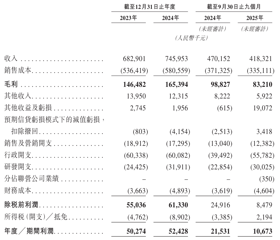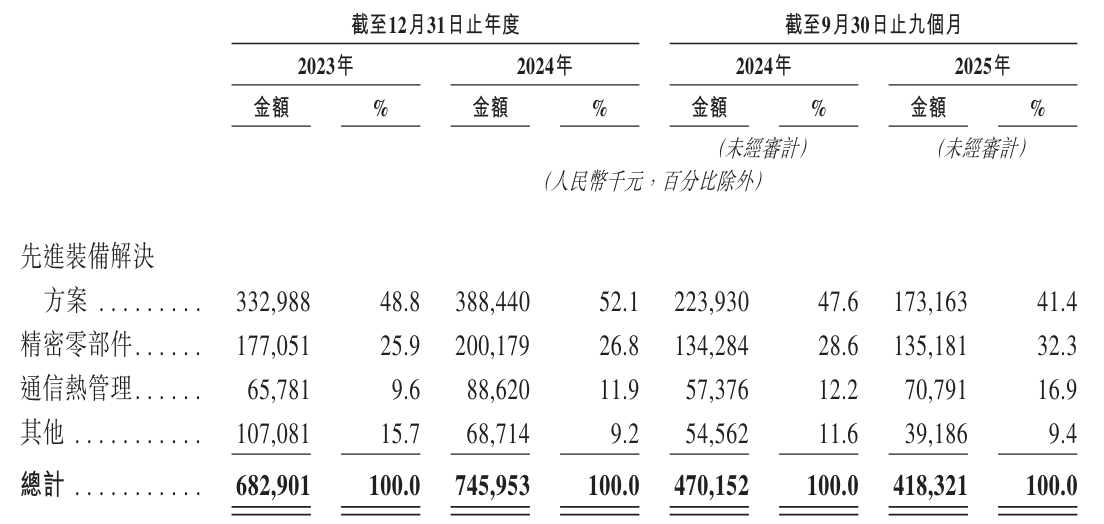 財務數(shù)據(jù)顯示,精智實業(yè)近年保持穩(wěn)健增長態(tài)勢。2023年及2024年分別實現(xiàn)營業(yè)收入6.83億元和7.46億元,對應毛利為1.46億元和1.65億元,凈利潤則達到5027萬元和5243萬元。2025年前九個月,公司營收規(guī)模達4.18億元,其中先進裝備解決方案貢獻1.73億元(占比41.4%),精密零部件業(yè)務收入1.35億元(占比32.3%),通信熱管理業(yè)務實現(xiàn)7079萬元收入(占比16.9%),其他業(yè)務收入3919萬元(占比9.4%)。同期毛利為8321萬元,凈利潤錄得1067萬元。