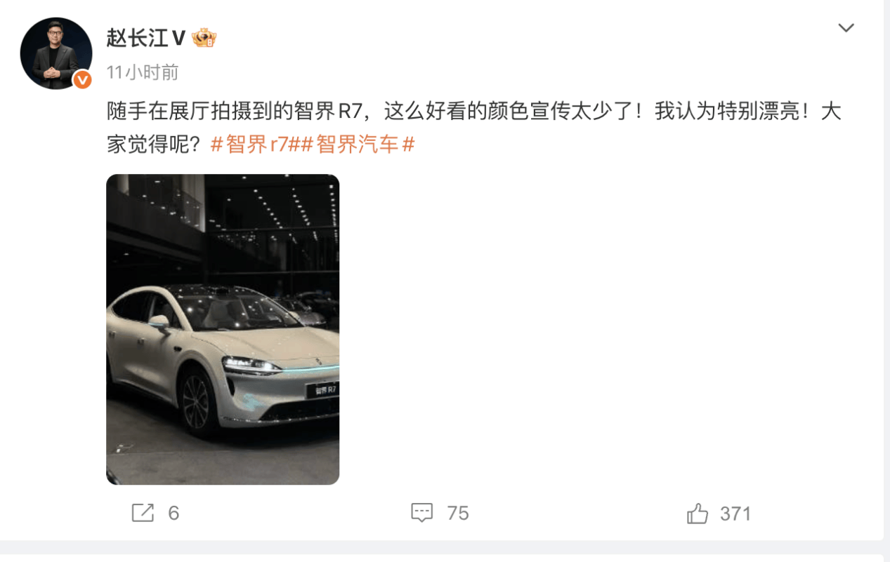 智界R7的配色也充分體現(xiàn)了這一點(diǎn)。趙長江在微博曬出該車型配色照片后,用戶紛紛給出好評,“黑外紅內(nèi)”的搭配被贊“帥字了得”,“清華紫”則憑借獨(dú)特質(zhì)感獲得廣泛關(guān)注。這些反饋表明,合適的配色能夠成為品牌與消費(fèi)者建立情感連接的橋梁。如果宣傳不到位,消費(fèi)者可能無法充分感知到配色的獨(dú)特魅力,進(jìn)而影響對車型顏值的評價(jià)和購買意愿。